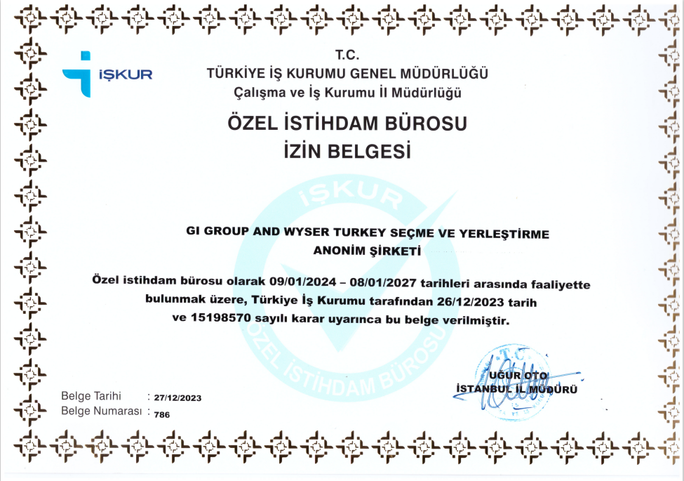 GI GROUP AND WYSER TURKEY SEÇME VE YERLEŞTİRME A.Ş. operates as a private employment office under the certificate no. 786 issued in accordance with the decision of Turkish Employment Agency dated 26/12/2023 and numbered 15198570, to be operated between the dates of 09/01/2024-08/01/2027. It is forbidden to ask money from the jobseekers according to the Law no. 4904. For submitting your complaints, you can call us at the following phone numbers. Provincial Directorate of Istanbul of Turkish Employment Agency: 0212 249 29 87 Address: Hacımimi Mah. Lüleciler Sk. No:4 Tophane/Beyoğlu/İSTANBUL. Turkish Employment Agency, Istanbul Labour and Employment Agency Service Center of Şişli: 0212 234 68 06 Address: Abidei-hürriyet Cad. Palazoğlu Sok. No:10 Şişli/İSTANBUL